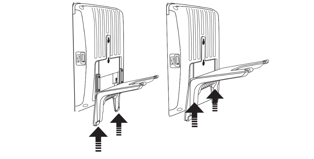 - Positionieren Sie die Nuten des Fußes unterhalb der Halterungsleisten an der Rückseite des Telefons. Fürden steileren Aufstellungswinkel müssen Sie die kurzen Schenkel, für den flacheren Aufstellungswinkel dielangen Schenkel auf die Halterungen schieben.